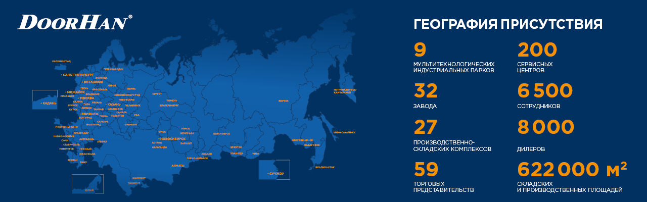 Международный концерн DoorHan — это промышленная группа глубокоинтегрированных производственных предприятий, общей целью которых является комплексная поставка полнокомплектных решений для объектов промышленного строительства, частного домостроения, а также объектов городской инфраструктуры и сельского хозяйства. Все предлагаемые решения полностью состоят из продукции DoorHan, кроме того, спроектированы и изготовлены на собственных заводах концерна DoorHan.